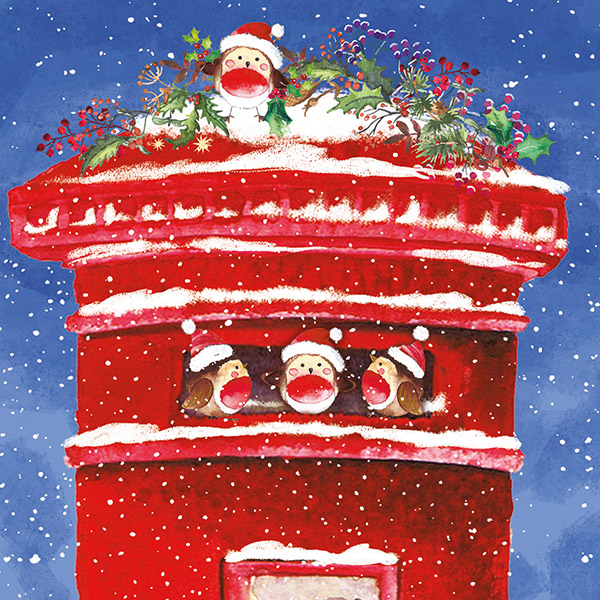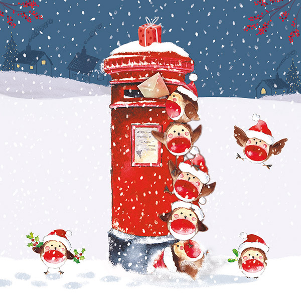 This festive twin pack features two joyful designs of robins in Santa hats around classic red postboxes: one perched in the snow among winter greenery, the other busy posting Christmas letters. Bright, cheerful, and full of seasonal charm.